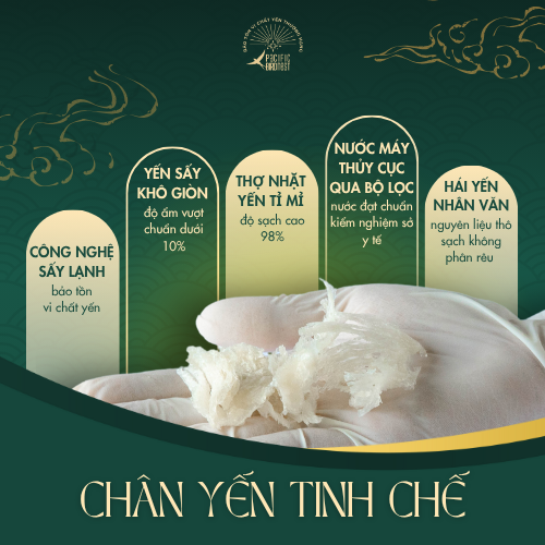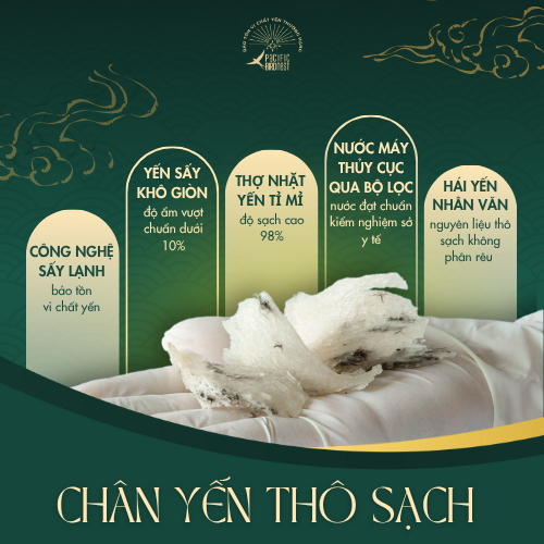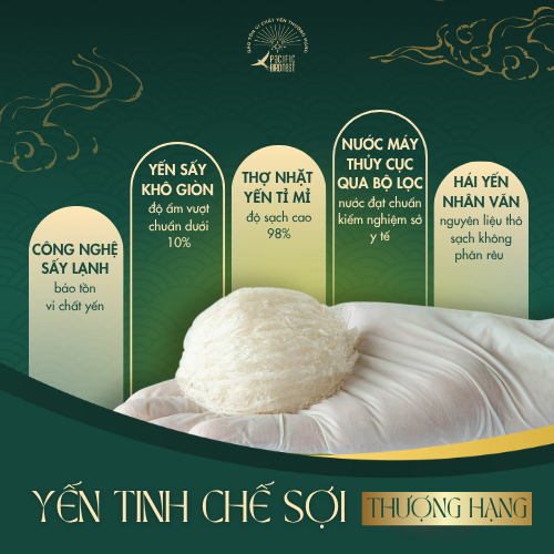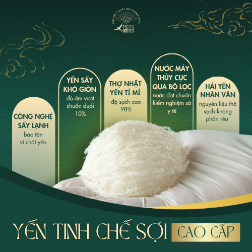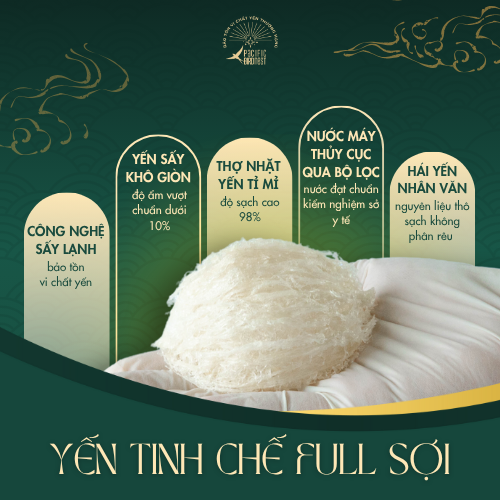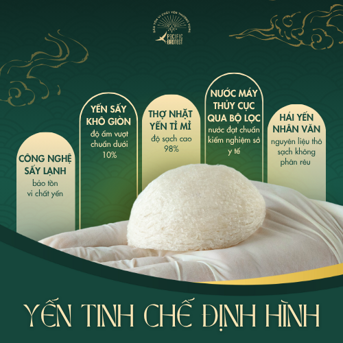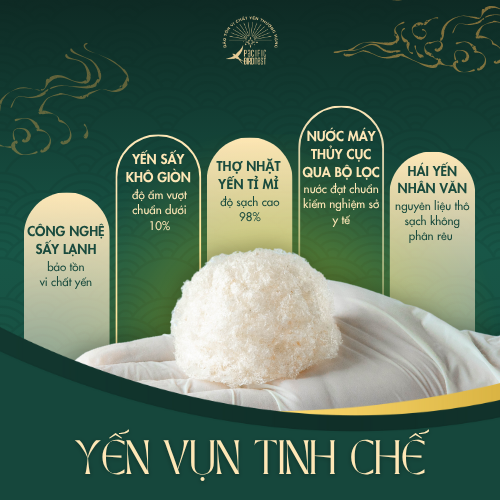 Sau khi sấy lạnh đến độ ẩm vượt chuẩn, trọng lượng viên yến từ 1 đến 1.5g, đảm bảo độ sạch lên đến 99% và bảo tồn vi chất yến tốt nhất.